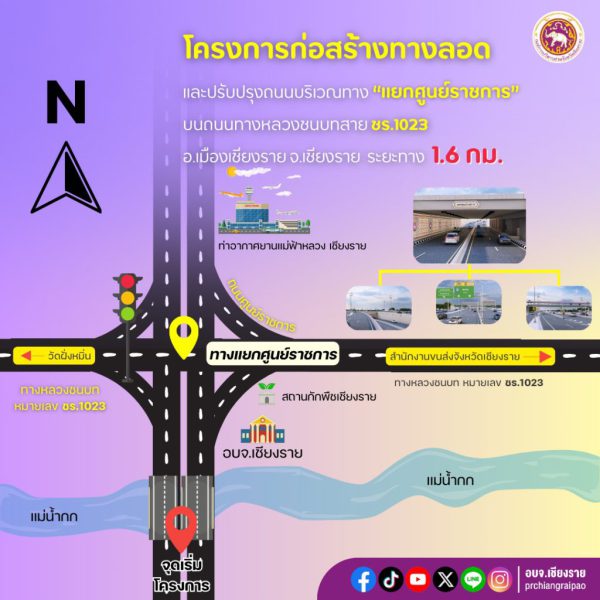 เริ่มแล้ว!! โครงการก่อสร้างทางลอดและปรับปรุงถนนบริเวณแยกศูนย์ราชการบนถนนสาย ชร.1023 อ.เมืองเชียงราย จ.เชียงราย ให้ประชาชนวางแผนให้พร้อมก่อนเดินทาง และขับขี่ด้วยความระมัดระวังในการสัญจร