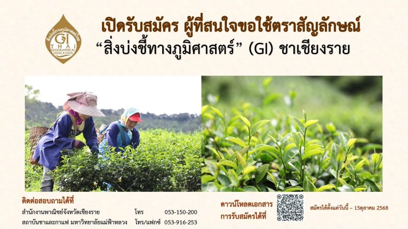 ขอเชิญผู้ประกอบการชา ที่สนใจสมัครขอยื่นใช้ตราสัญลักษณ์สิ่งบ่งชี้ทางภูมิศาสตร์ (GI) ชาเชียงราย รอบที่ 3/2568 (รอบพิเศษ)