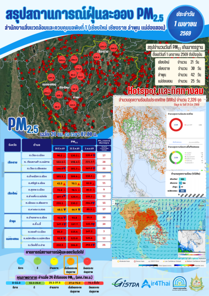 สรุปสถานการณ์ฝุ่น PM2.5 (1 เม.ย.69) เชียงราย เชียงใหม่ ลำพูน แม่ฮ่องสอน