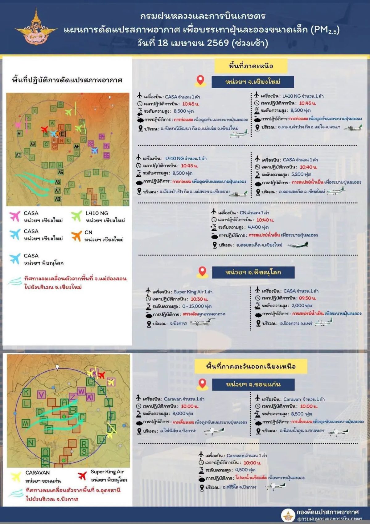 วันนี้ (18 เมษายน 2569) เวลา 10.45 น. มีการปฏิบัติการฝนหลวงเพื่อบรรเทาปัญหาฝุ่นละอองในพื้นที่ภาคเหนือ โดยเครื่องบินฝนหลวงแบบ L410NG จำนวน 1 ลำ ได้ขึ้นบินปฏิบัติภารกิจก่อเมฆ ที่ระดับความสูงประมาณ 8,500 ฟุต